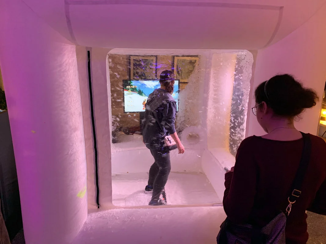 To add a hint more realism to the effect, the game is fitted inside our ice cube snow blizzard inflatable where you will be immersed with a wind/ dry snow simulator delivered in a wild fury giving you amazing sensations to make the experience as real as it can be without stepping onto a real life snowboard.